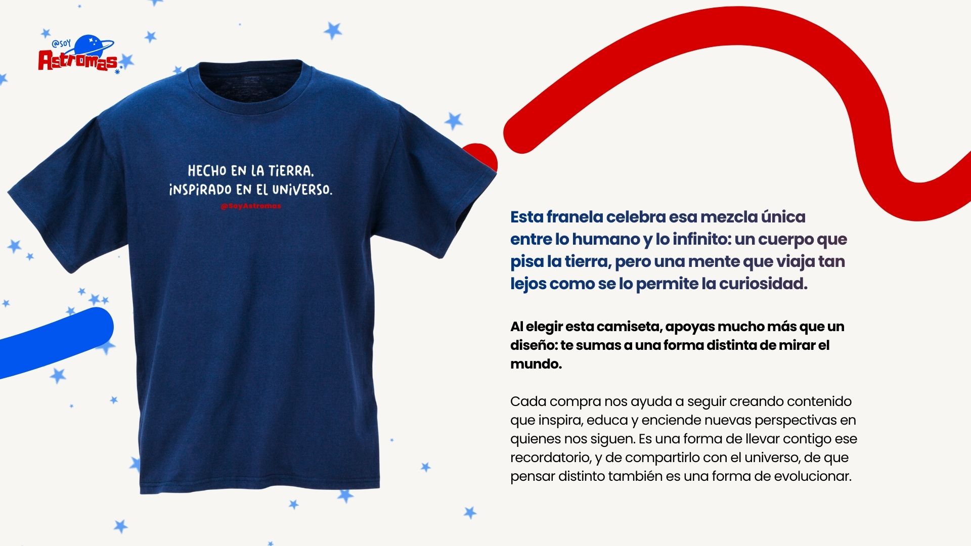 Esta polera celebra esa mezcla única entre lo humano y lo infinito: un cuerpo que pisa la tierra, pero una mente que viaja tan lejos como se lo permite la curiosidad.